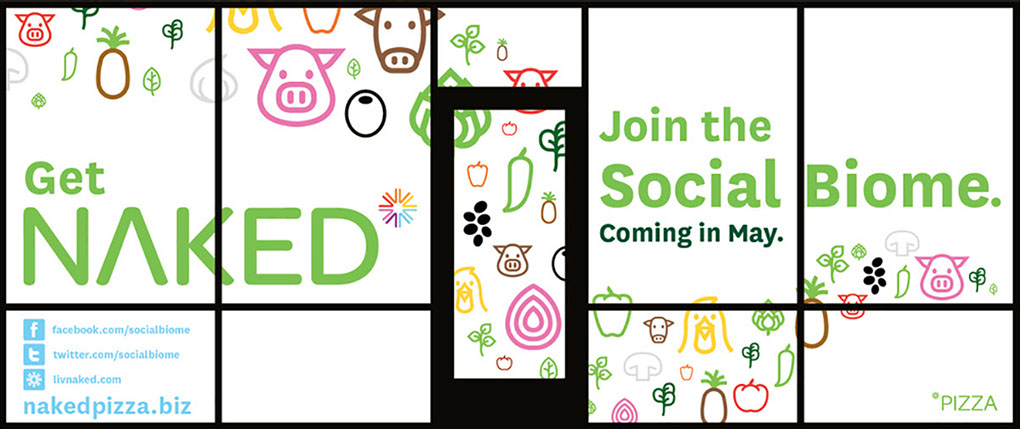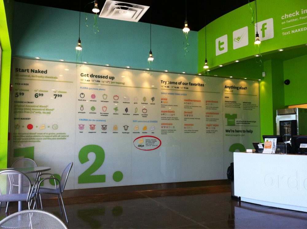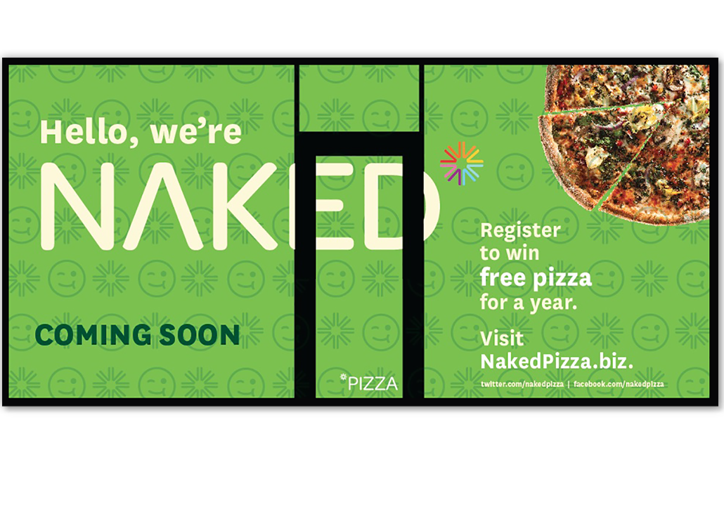Clings were a major part of NAKED Pizza's brand presence. While a new location was under construction, they hid the work happening inside while generating pre-opening buzz within each store’s local community. Once the store opened, clings played an integral part in the ordering experience and customer education, generation of website traffic, and the overall store aesthetic.
