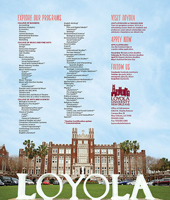 The View Book is Loyola's premier printed recruitment piece. It is the booklet that Admissions counselors most often take to student meet-and-greet events, and the first piece in a series of materials that interested prospective students and their parents receive in the mail to introduce them to Loyola University New Orleans.