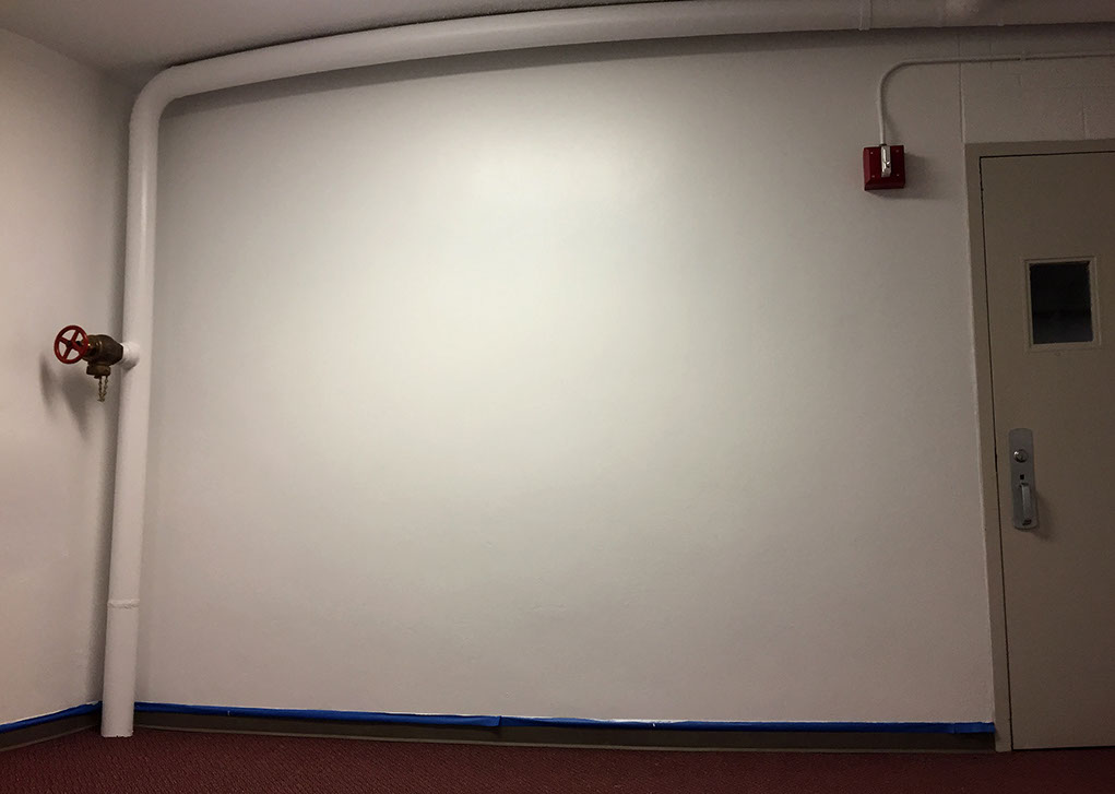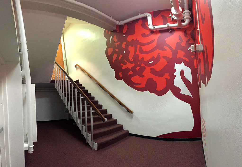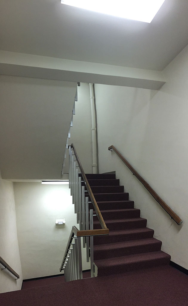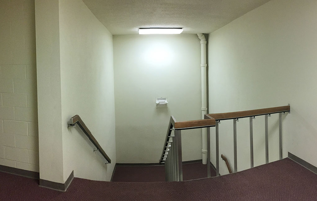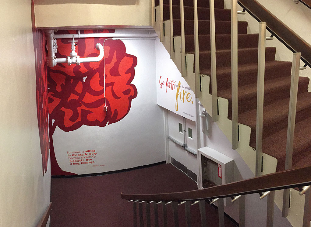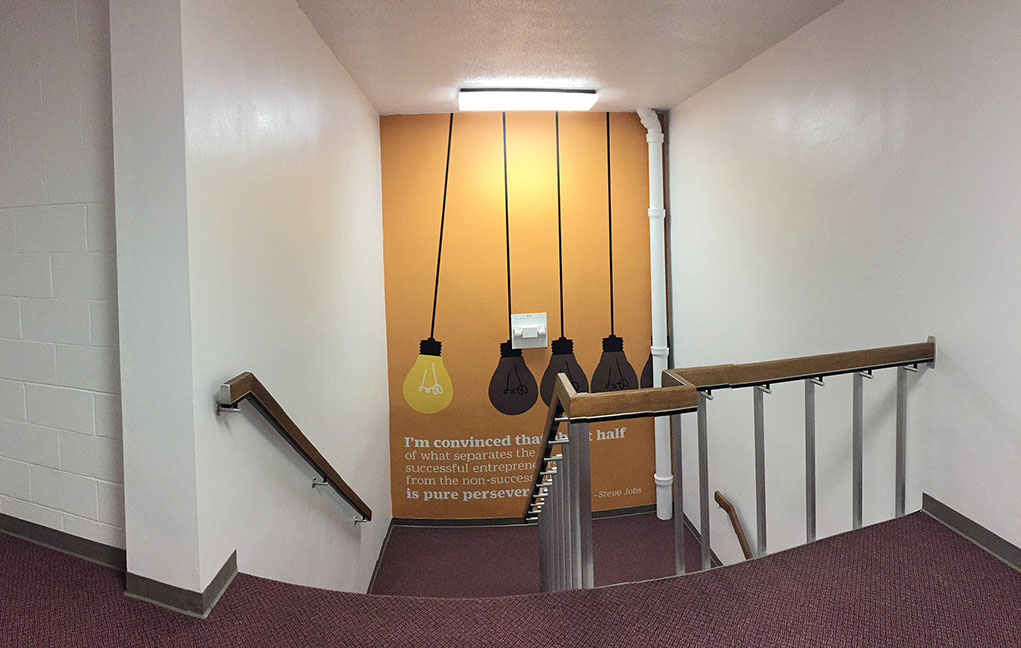 Unfortunately, one of the darkest and most outdated parts of the building was this windowless 3-floor, 5-level stairwell. When the College of Business recently won national recognition as one of the best business schools in the country, they received an influx of both undergrad and MBA applications and the department asked if there was anything we could do over the summer to brighten up the space for returning students and prospective recruits.