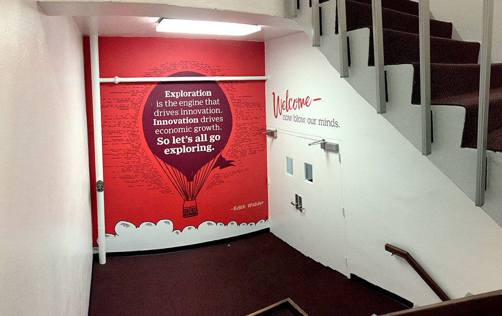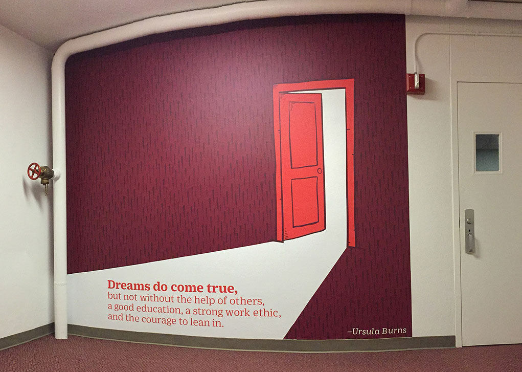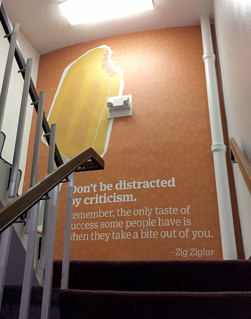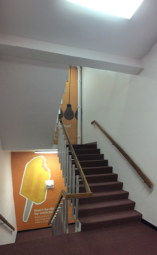 We started with a fresh coat of white paint and all new light fixtures, and then added floor-to-ceiling wall graphics featuring illustrated quotes from famous business leaders.