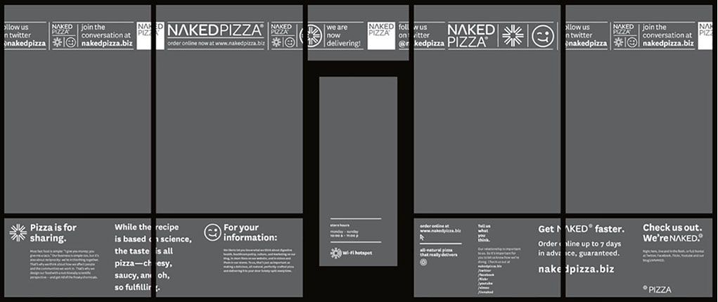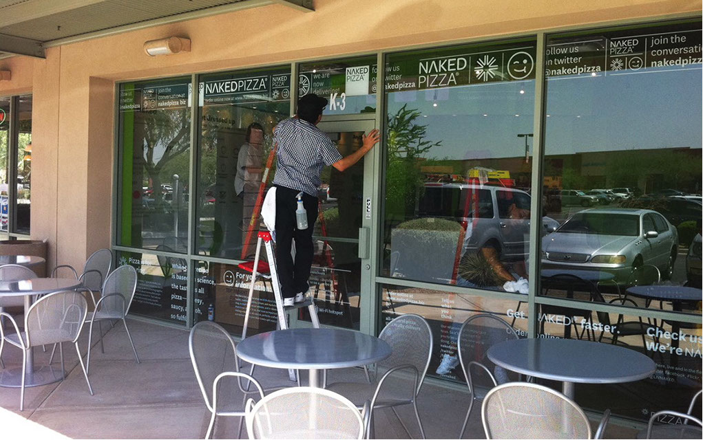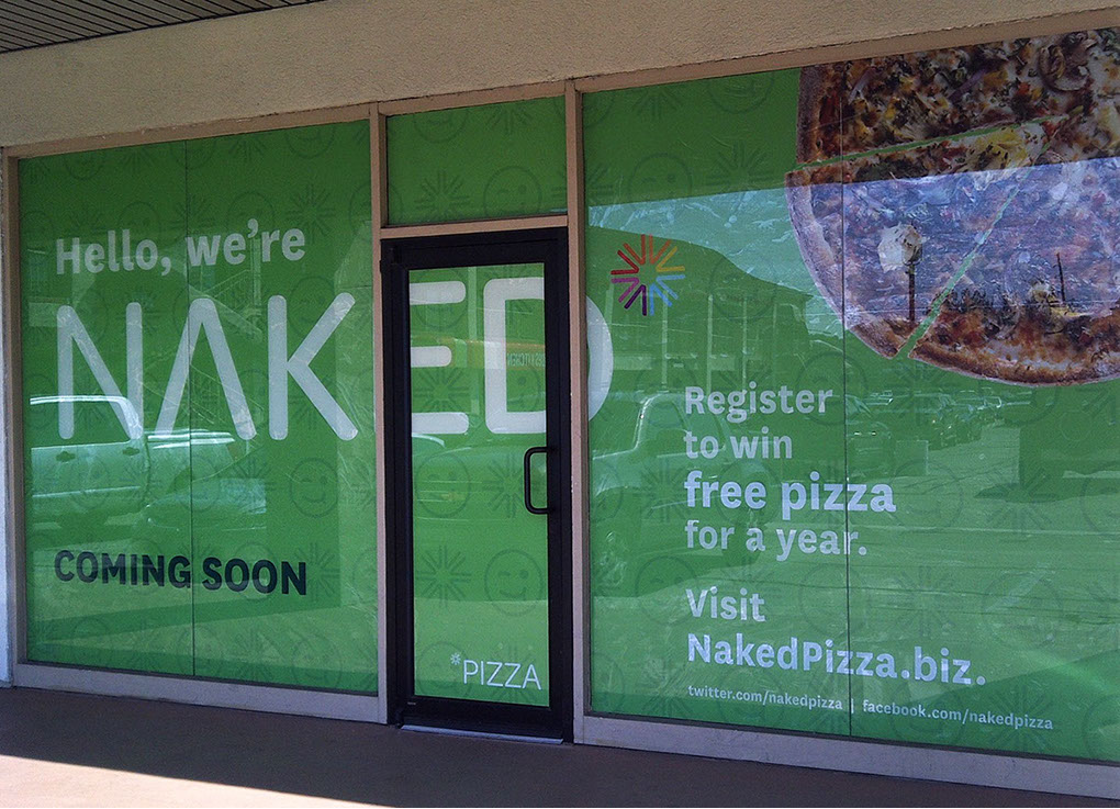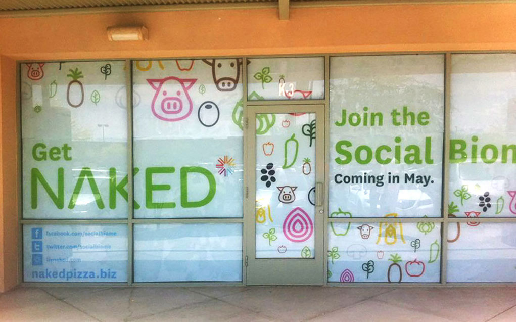 Clings were a major part of NAKED Pizza's brand presence. While a new location was under construction, they hid the work happening inside while generating pre-opening buzz within each store’s local community. Once the store opened, clings played an integral part in the ordering experience and customer education, generation of website traffic, and the overall store aesthetic.
